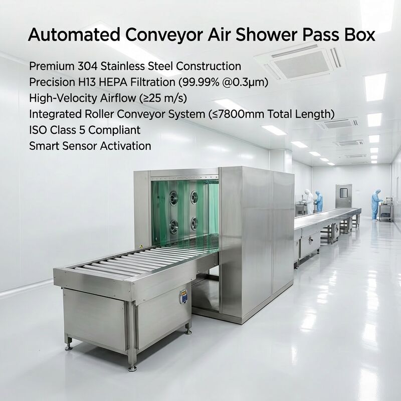 Integriertes Rollenförderzeug + HEPA-Luftduschsystem.